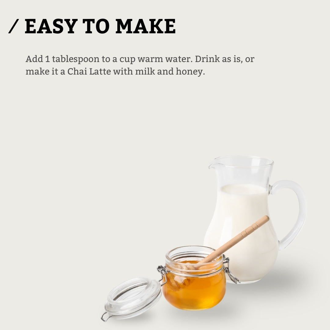 Drink as is, or make it a Chai Latte with milk and honey – the choice is yours. You're in control.